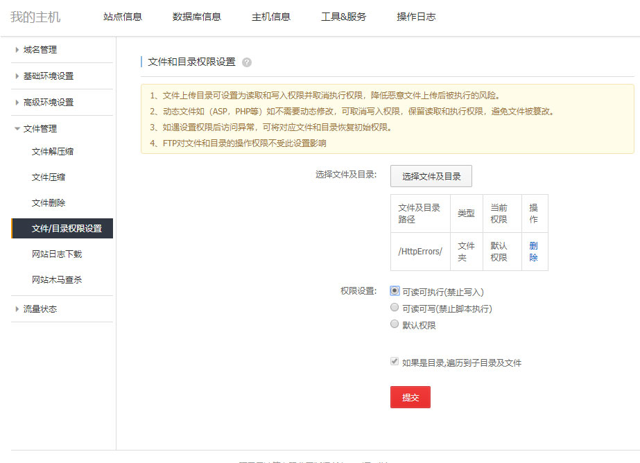 ASP或PHP空間設置方法一樣,控制面板主機控制面板-文件管理-文件和目錄權限設置-再根據(jù)提示完成設置,網(wǎng)站文件和目錄一經(jīng)設置了禁止寫入權限,黑客將無法通過程序漏洞上傳木馬程序,這也是阿里云安全技術所在。具體操作如下圖所示:
