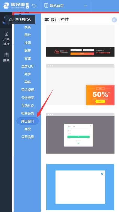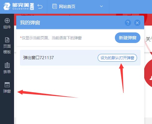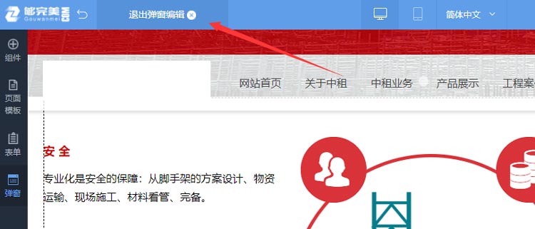 彈窗你可以理解為一個(gè)區(qū)域范圍,只是為彈出的顯示范圍,那么彈窗里的內(nèi)容可以支持任意內(nèi)容,可以是廣告圖片文字、最新文章列表、會員注冊登錄組件、調(diào)查問卷表單等,如同設(shè)計(jì)網(wǎng)站頁面一樣。一旦彈窗內(nèi)容設(shè)計(jì)完成,需要退出彈窗編輯狀態(tài),如需對彈窗的內(nèi)容重新設(shè)計(jì),就需要進(jìn)入彈窗編輯,學(xué)會進(jìn)入彈窗編輯和退出彈窗編輯,網(wǎng)站頁面有彈窗功能再也不用愁了。1、點(diǎn)擊這里退出彈窗編輯