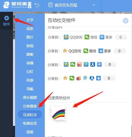 方法同上,在頭尾文件處添加方法:組件-互動社交-百度商橋控件-在頁尾處點(diǎn)擊一下,然后再設(shè)置控制-將在百度商橋代碼填入并保存即可。