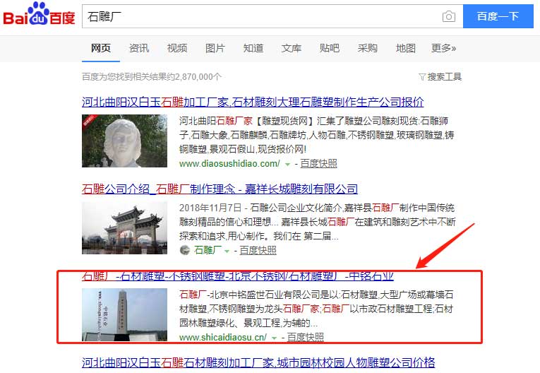 石雕廠/石材雕塑/不銹鋼雕塑網(wǎng)站由環(huán)宇網(wǎng)絡(luò)設(shè)計(jì)制作,網(wǎng)站官方企業(yè)名稱:北京中銘盛世石業(yè)有限公司(簡(jiǎn)稱中銘實(shí)業(yè)),主要經(jīng)營(yíng):石材建筑幕墻;大型廣場(chǎng)石材;石雕;不銹鋼雕塑;受托中銘實(shí)業(yè)需要將網(wǎng)站排名做到百度首頁(yè),網(wǎng)址:shicaidiaosu.cn,排名關(guān)鍵詞是“石雕廠”/“石材雕塑”/“不銹鋼雕塑”。該網(wǎng)站曾上線一年多均無(wú)一自然排名和流量,經(jīng)環(huán)宇網(wǎng)絡(luò)優(yōu)化后,網(wǎng)站終于有了指定關(guān)鍵詞上了排名。以圖見(jiàn)證