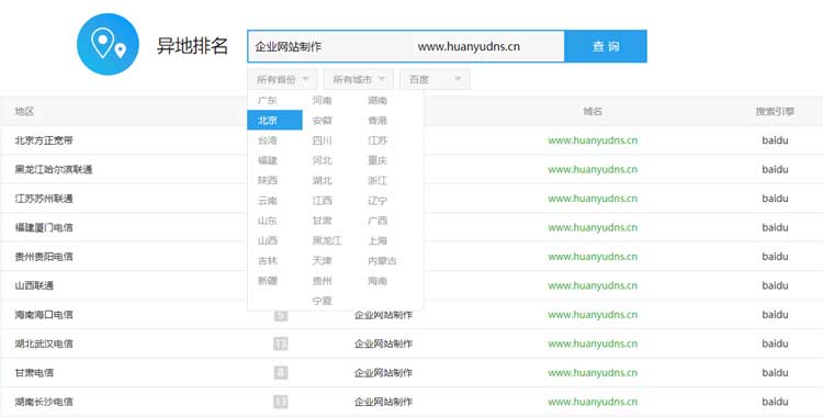 網(wǎng)站關鍵詞排名在不同地區(qū),搜索排名的位置有所不同,網(wǎng)站關鍵詞排名查詢工具為您提供網(wǎng)站關鍵詞排名查詢、異地關鍵詞排名查詢,讓您快速了解網(wǎng)站關鍵詞全國范圍內不同區(qū)域的搜索引擎排名情況。