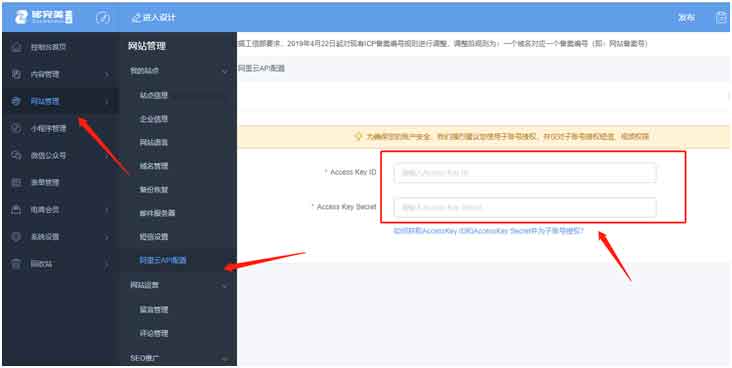 復制子用戶AccessKeyID與AccessKeySecret值,再登錄網(wǎng)站后臺,點擊阿里云API配置處,對應值粘貼后保存