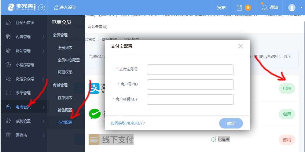 登錄網(wǎng)站后臺(tái):ac.hzx.aligl.cn,找到電商會(huì)員-支付配置-啟用支付寶-將彈出配置窗口,填寫支付寶帳號(hào)/PID/KEY即可,如下圖所示,但值得提示的是,這里的支付寶應(yīng)該是屬于企業(yè)支付寶。