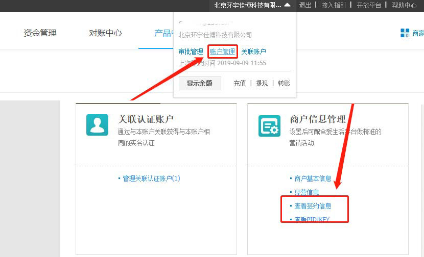 支付寶簽約網(wǎng)站收款成功后,點(diǎn)帳戶管理,從商戶信息管理欄目里找到查看PID/KEY配置碼,如下圖所示;