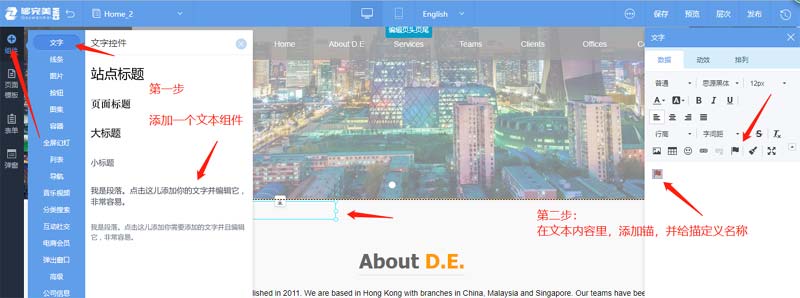 先打開某頁面,通過插入組件-文字-將文字插入到某個位置,再點文字設(shè)置-插入錨標(biāo)記,要記住設(shè)置的錨名稱哦,如下圖所示