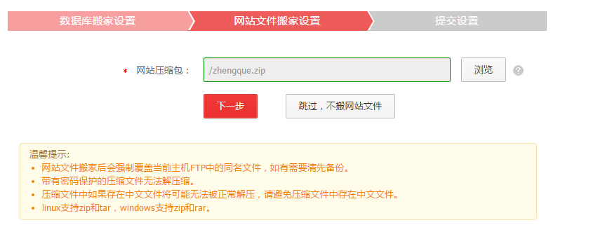 用戶需要選擇已經(jīng)使用FTP工具上傳到主機(jī)的網(wǎng)站文件壓縮包。