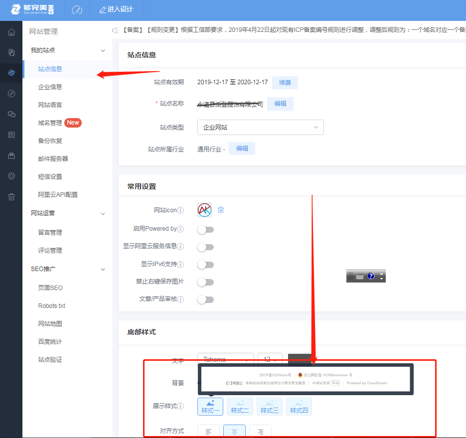 備案號(hào)在這里并設(shè)置樣式保存后,如果有公安備案審批下來的備案號(hào),請(qǐng)?zhí)顚憣?duì)應(yīng)的框里;如果未在網(wǎng)站底部添加備案號(hào),被相關(guān)部門核查出來將處以五千元以上一萬元以下罰款...