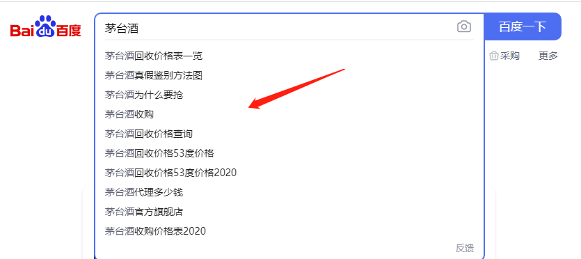 舉例說明,當(dāng)訪客在百度搜索引擎輸入“茅臺酒”這兩個字的時(shí)候,搜索引擎就從推薦詞條庫中檢索出以“茅臺酒”這兩個字打頭的詞條,并根據(jù)搜索量從大到小排序,組建成下拉菜單。搜索引擎下拉菜單的最大數(shù)量為 10 條。